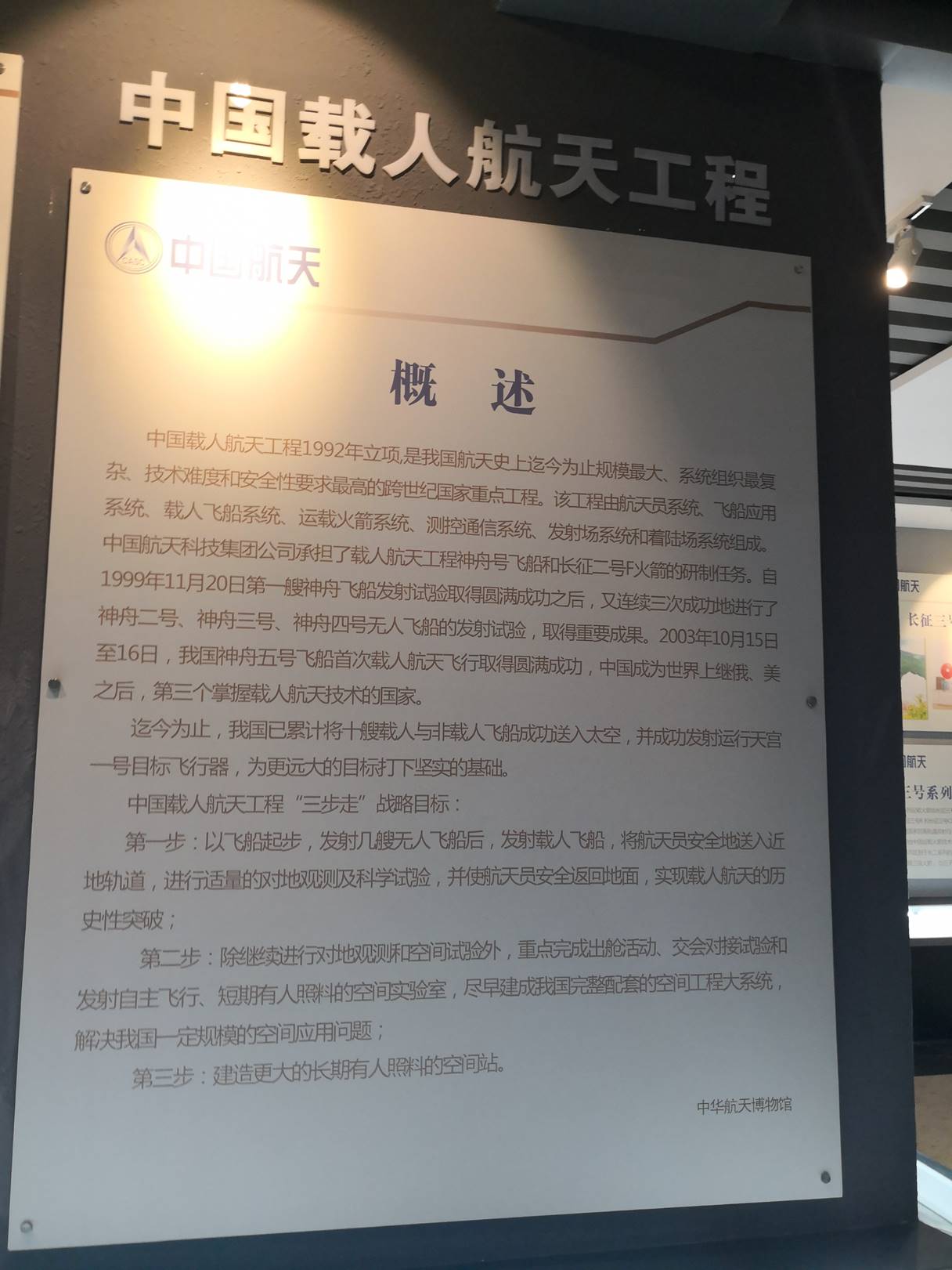 馆内展有长征四号的实体,长征二号的一级和二级发动机,甚至还有火箭发射成功后回落地面的整流罩。这一切的一切对于我这个文科生而言都是新鲜且震撼的。在墙壁上悬挂的关于运载火箭和载人航天技术的图文,也让我对中国的航天事业的发展历程有了更加清晰的认识。看到长征系列、神舟系列,我的思绪又飘回到了几年前,那个时候我和爸爸正守在电视机前看着神舟七号发射成功的直播。人类自古以来,就对那广袤无垠的天空充满向往,嫦娥奔月,夸父逐日。我们对头顶的那片天空,总是充满敬畏,但又心驰神往,我们对天空的探索从未停止过。而2008年,中国终于做到了,翟志刚实现了中国历史上的第一次太空漫步,中国也终于成为第三个有能力把太空人送上太空并进行太空漫步的国家。这是中国航天事业的进步,也是国家的进步!航天事业是一项具有国际竞争性的事业,航天事业的发展水平代表着一个国家的综合国力和科技水平,经过几代人航天人的艰苦奋斗,我们才能取得今日的伟大成就。