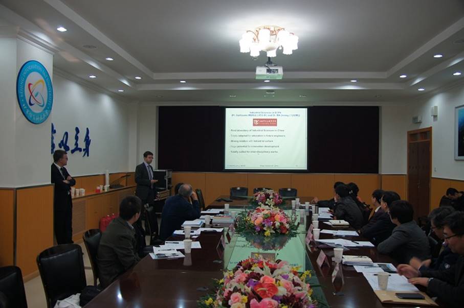 北航中法公司副经理于黎明教授、信息科技大学教务处王兴芬处长分别介绍了双方教学团队情况。Ives DULAC教授介绍了法国的工程师培养体系和特色。Vincent CRESPEL和Guillaume MERLE教授介绍了法国的工业科学课程教学内容,以及配套的实践课程体系。