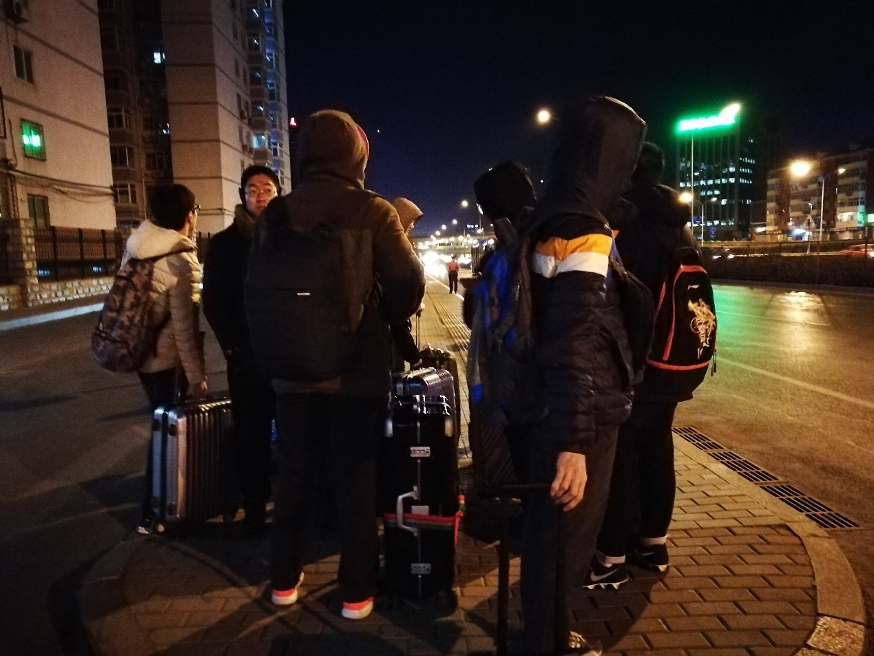 | 图 1 北京时间2017年2月4日晚员工们在北航北门等待机场大巴 |