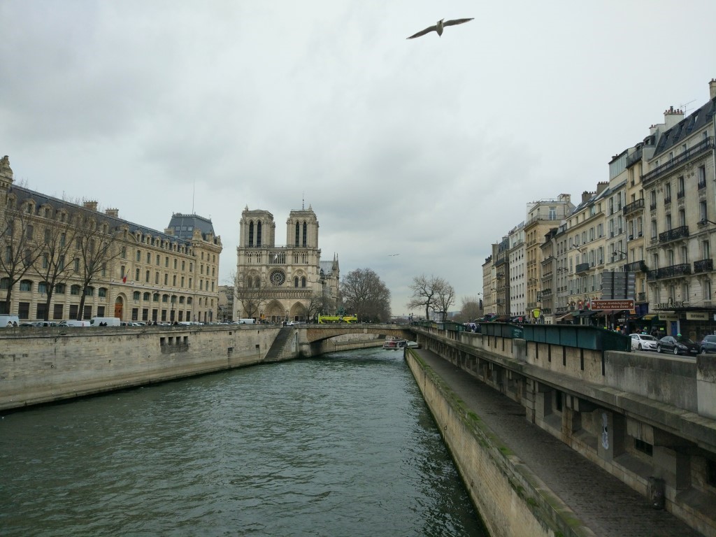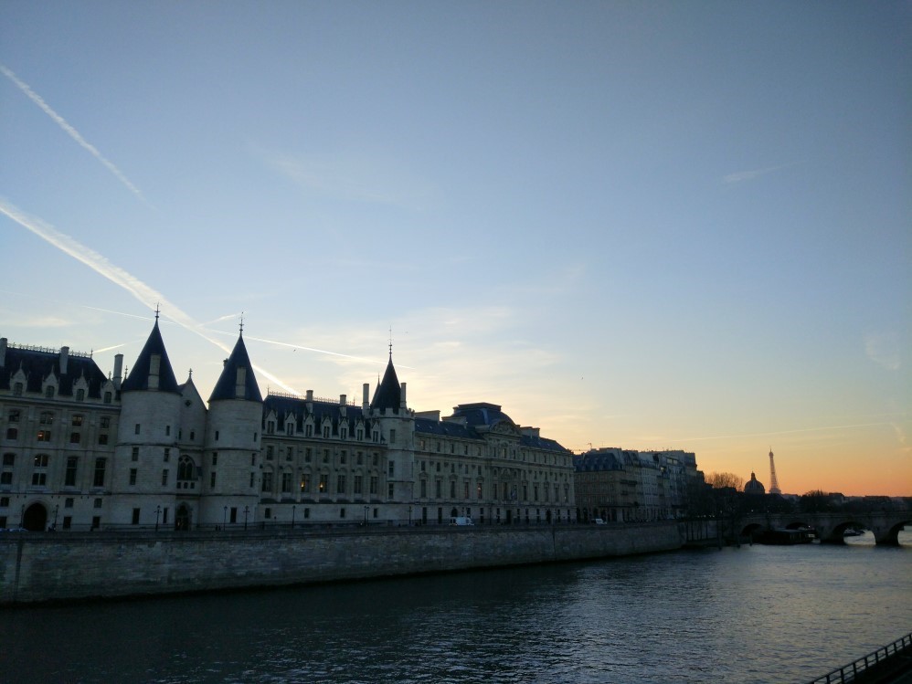 傍晚,我们一行人来到了塞纳河边。闲散地散步,喂那些胖得飞不起来的鸽子——难怪有人说,在巴黎,连鸟儿都是幸福的。碧绿的河水波光粼粼,白色的河鸥盘旋在上空,不时有苍蝇船在石桥之间穿梭。左岸,古老的城堡露出两个尖顶,远处的晚霞中依稀还能看到埃菲尔铁塔的斜影,怎么拍都是一副绝佳的风景照。
