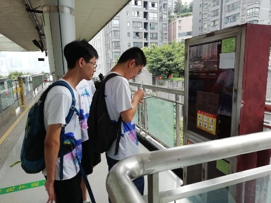航轨实践队利用十天时间对成渝两市12条轨道线路共50个车站就换乘、设施、周边环境和文化四个方面进行了考察。7月26日,队员们在曾家岩车站进行初次考察。40℃高温下,单轨列车驶来时带来的热风是站台上唯一的清凉。然而作为站务员要一天都在站台上值班,队员体会到轨道人的责任。未来的日子里,队员们在车站里来来回回,一杆笔在复杂的立体图上记录下一切,又马不停蹄的赶往下一个站……虽然劳累,但看到一张张标注得密密麻麻的示意图时,队员们的内心充满了满足与快乐。