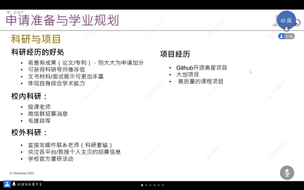 随后,林威重点讲述了自己的申请准备和学业规划。林威同学列明了GPA、语言成绩以及GRE成绩的申请条件,并就提高成绩、准备时间方面提出相关的建议;科研项目可以体现员工自身的综合学术能力,因此在申请过程中也非常重要,校内科研和校外科研也有许多途径可供同学们选择,比如公司官方暑研活动;竞赛经历也对申请有很大的加分,比如ACM国际老员工程序设计竞赛(ACM-ICPC)、Kaggle/天池、美国老员工数学联模比赛(MCM-ICM)等。