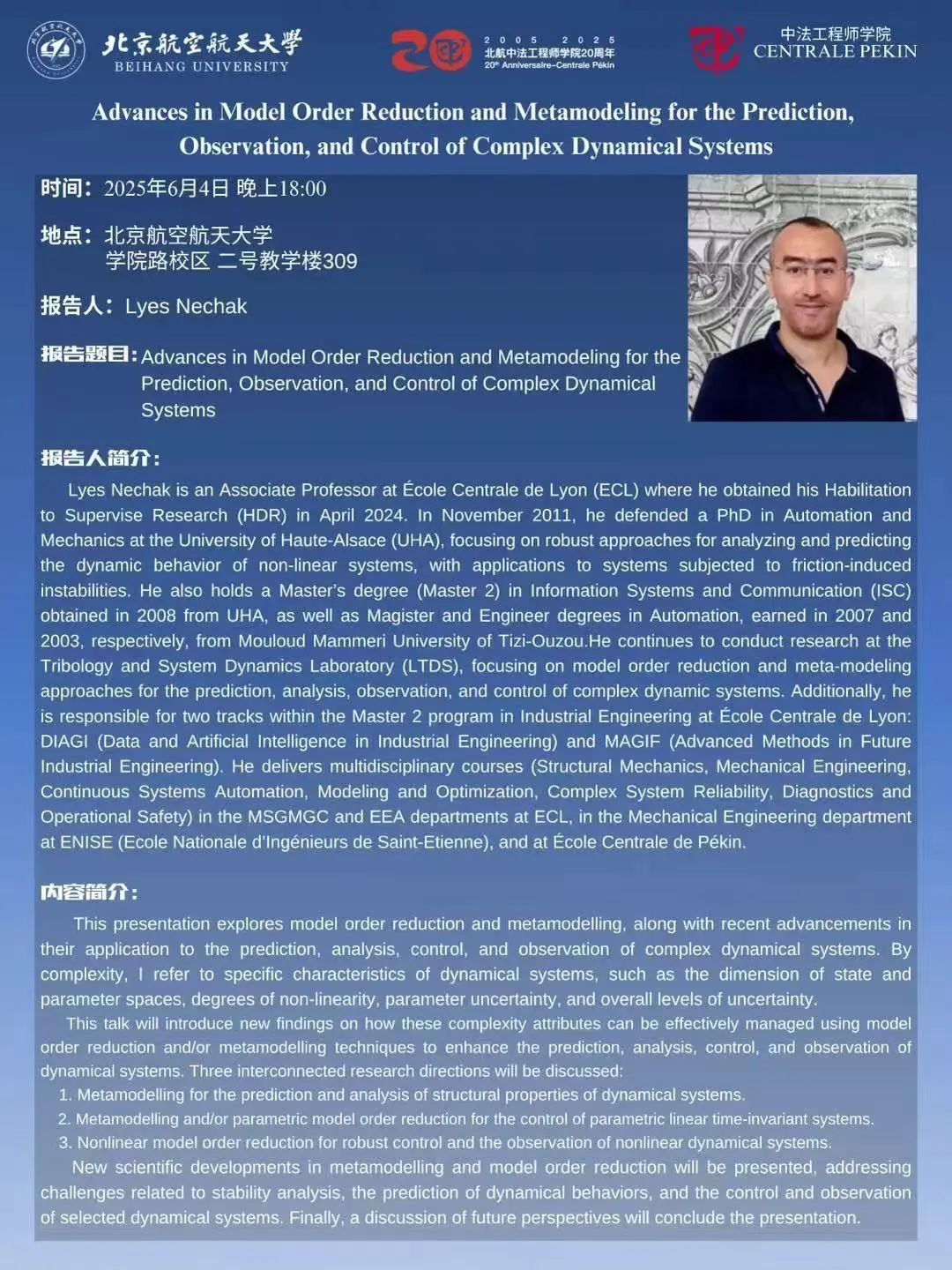 Lyes Nechak ,里昂中央理工公司(École Centrale de Lyon, ECL)副教授,于2024年4月获得指导研究资格(Habilitation à Diriger des Recherches, HDR)。他于2011年11月在上阿尔萨斯大学(University of Haute-Alsace, UHA)获得自动化与力学博士学位,研究方向为非线性系统动态行为分析与预测的鲁棒方法,重点应用于受摩擦诱发不稳定性影响的系统。他还拥有上阿尔萨斯大学于2008年授予的信息系统与通信(Information Systems and Communication, ISC)硕士学位(Master 2),以及2007年和2003年分别于提齐乌祖穆卢德·马梅里大学(Mouloud Mammeri University of Tizi-Ouzou)获得的自动化学位(Magister)和工程师学位。他目前继续在摩擦学与系统动力学实验室(Tribology and System Dynamics Laboratory, LTDS)开展研究,专注于复杂动力系统的模型降阶与元建模技术,以实现预测、分析、观测与控制。此外,他在里昂中央理工公司工业工程硕士项目(Master 2)中负责两个方向:DIAGI(工业工程中的数据与人工智能)和MAGIF(未来工业工程中的先进方法)。他在里昂中央理工公司的MSGMGC和EEA系、圣艾蒂安国立工程公司(ENISE)机械工程系,以及北京中央理工公司(École Centrale de Pékin)讲授多学科课程(结构力学、机械工程、连续系统自动化、建模与优化、复杂系统可靠性、诊断与操作安全)。