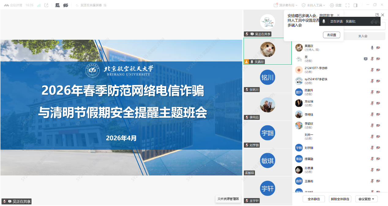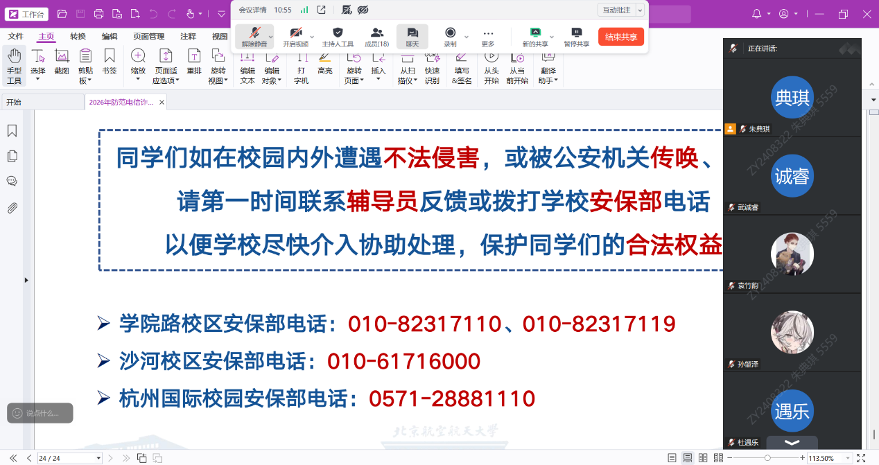 会议明确工作时限与要求,公司本研各年级通过线上线下相结合的方式召开主题班会,实现出行安全、宿舍安全、反诈提醒全覆盖,切实将安全工作要求传达到每一位员工,推动校园安全工作落地见效。