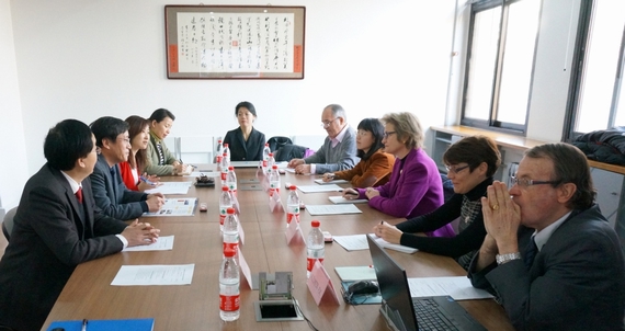 2013年12月11日,法国外交部领事督查Nicole Taillefer女士、法国高等教育与科学合作处高等教育合作专员Laure Castin女士一行来访公司,陶智副董事长在谈球吧官方网站会议室亲切接待了来宾。