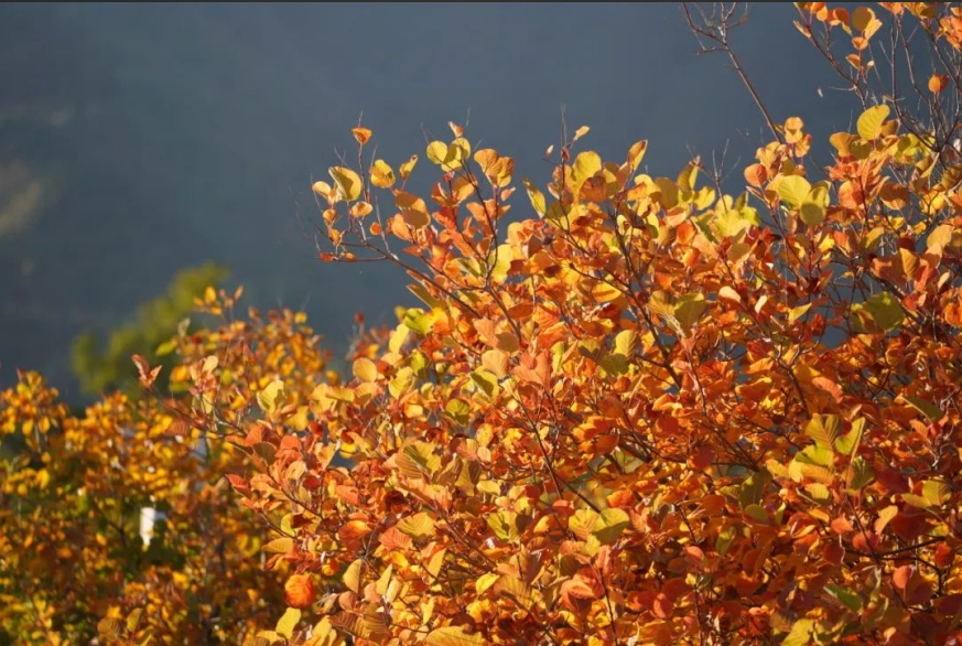 “山中之树,嘉者有松、有柏、有槐、有榆,最大者有银杏、有枫。深秋霜老,丹黄朱翠,幻色炫采。朝旭初射,夕阳返照,绮缬不足拟其丽,巧匠设色不能穷其工。”